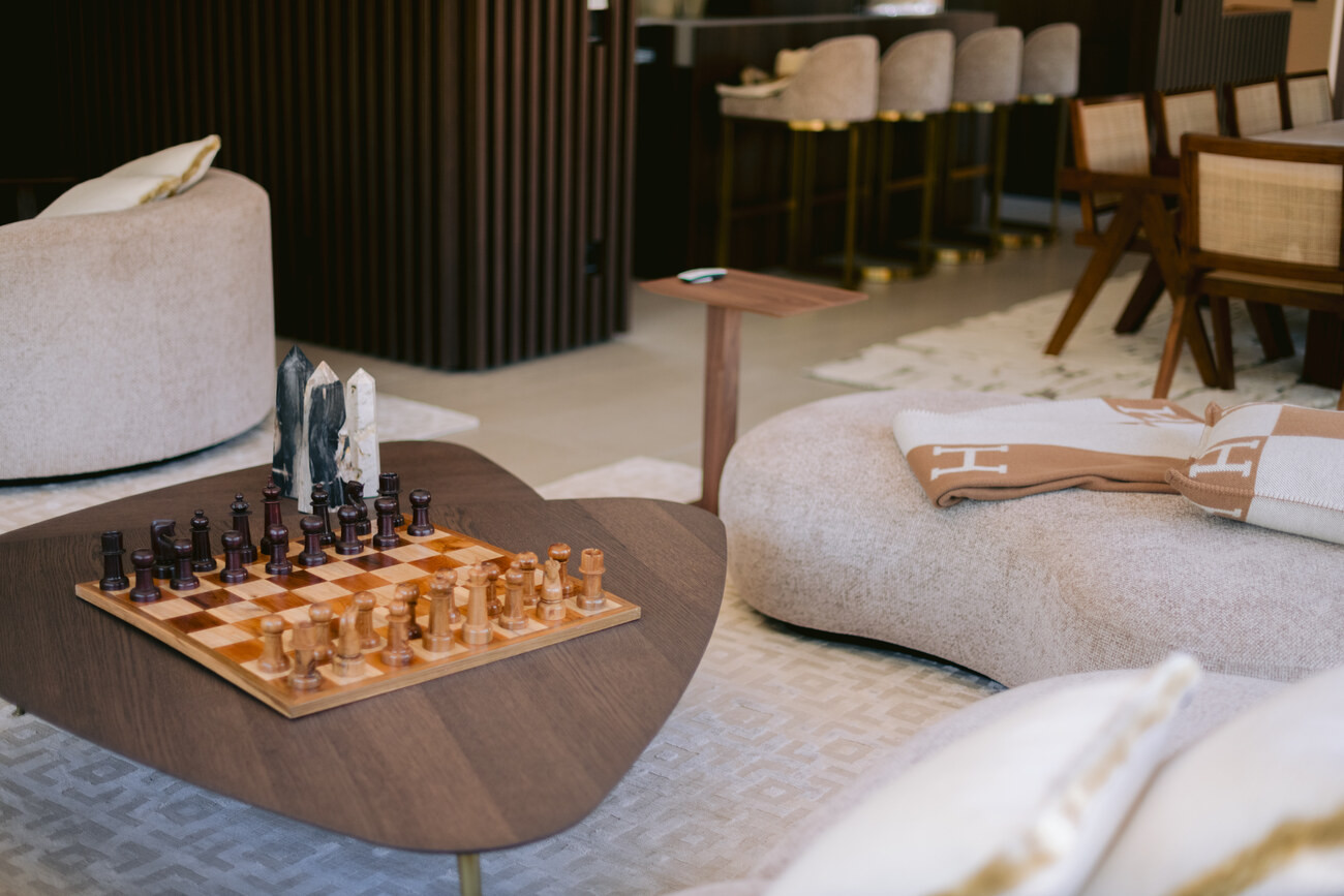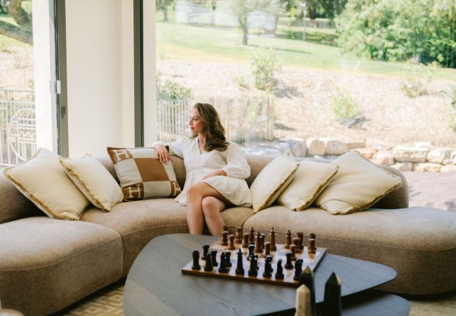 The main villa offers a vast open-plan living space of over 120 m² integrating a living room, dining room, bar, wine cellar and a fully equipped open kitchen. The large bay windows ensure exceptional natural light and extend the space towards the exterior.