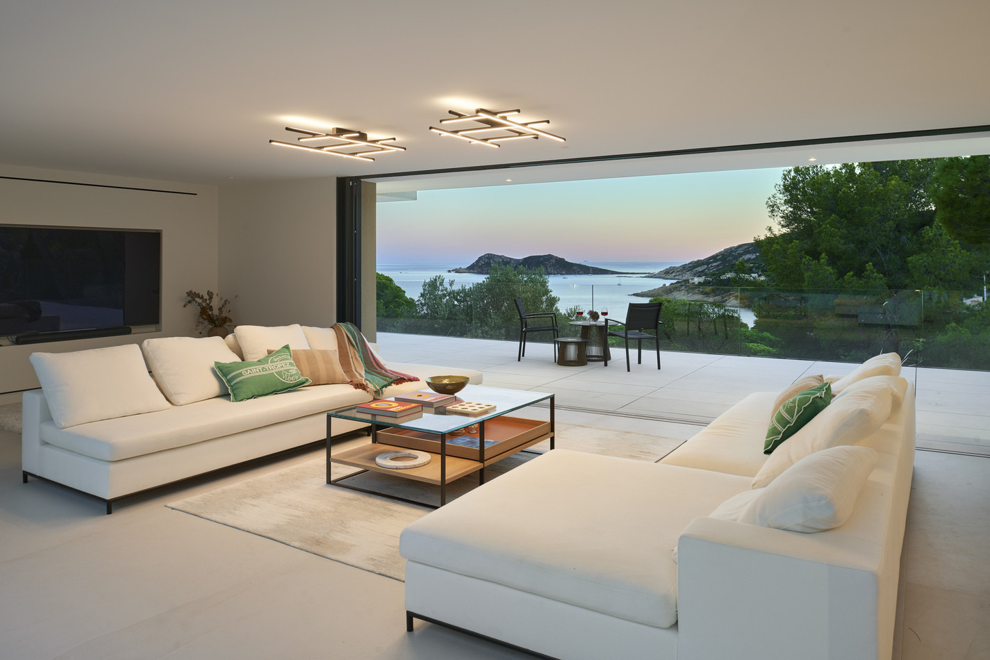 The interior is equipped with all modern comforts: 7 bathrooms (6 with shower and 1 with bathtub), a fully equipped American kitchen with high-end appliances such as a dishwasher, coffee machine, and a large refrigerator. The villa has 7 televisions, a safe, an iron, and a complete air conditioning system.