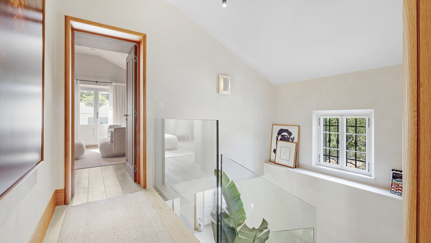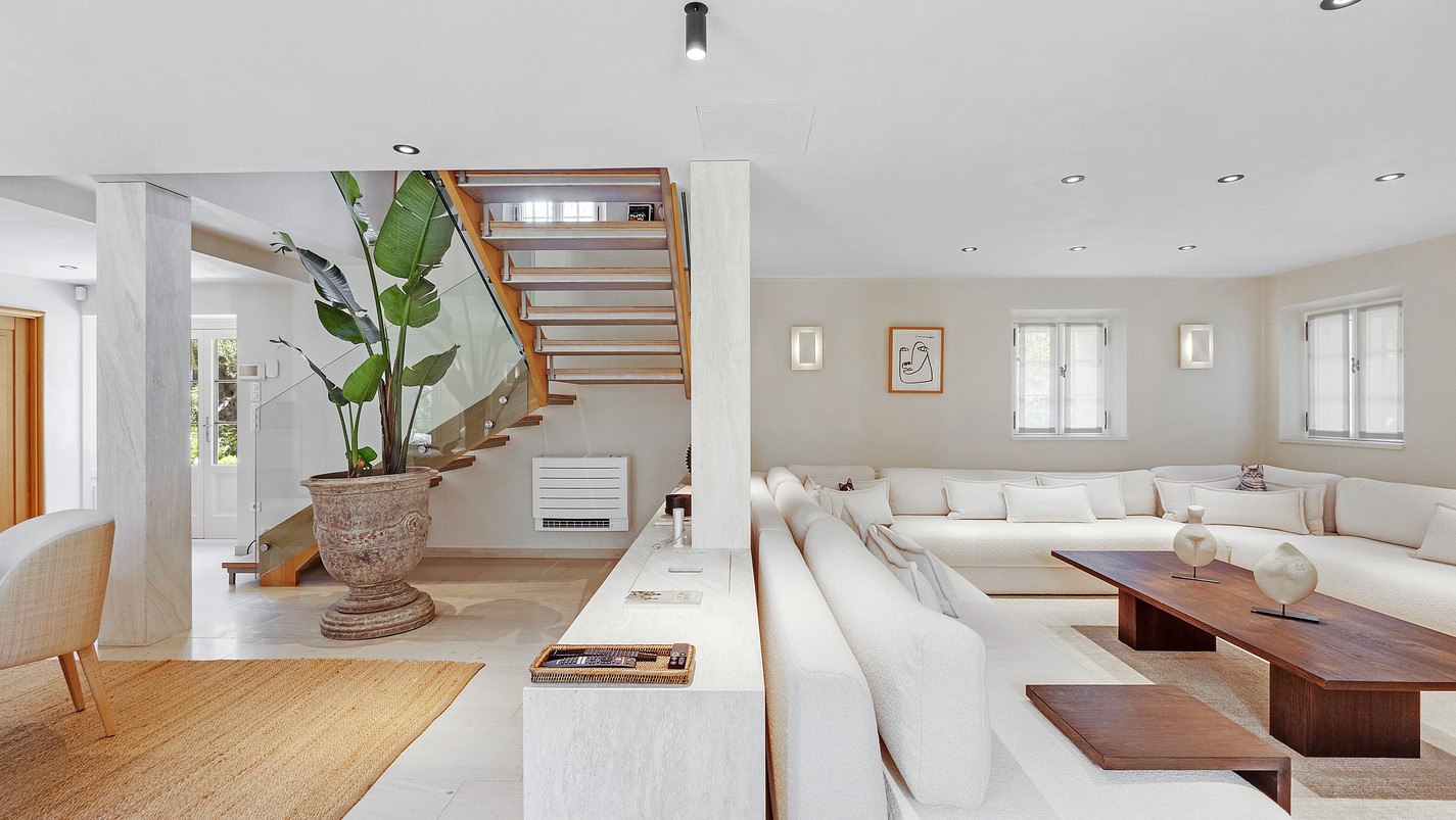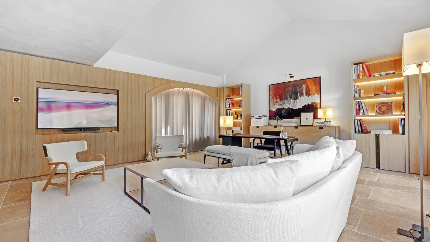 The house is organised around a vast, bright living area, widely open to the outside thanks to large bay windows overlooking the terraces and pool area.