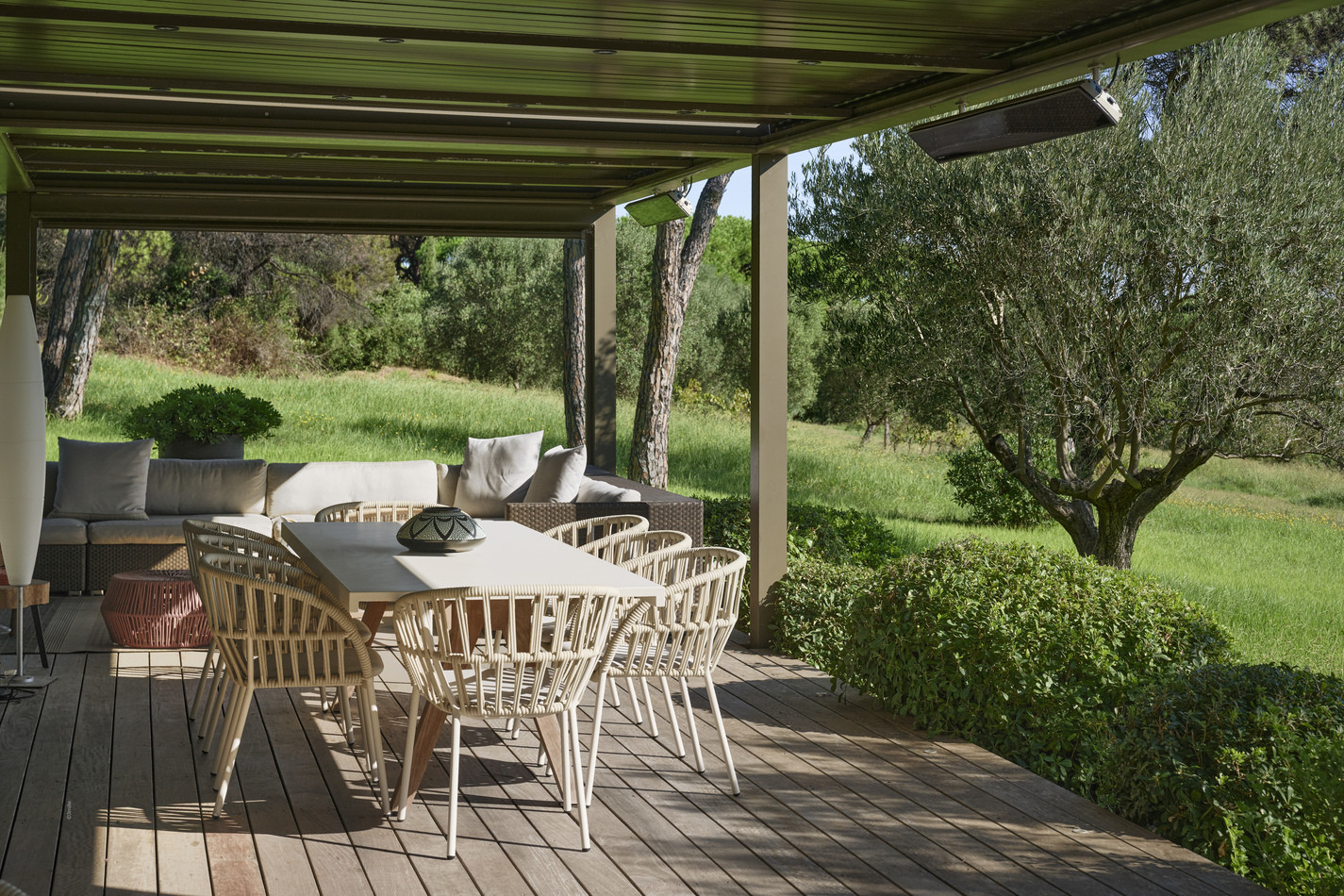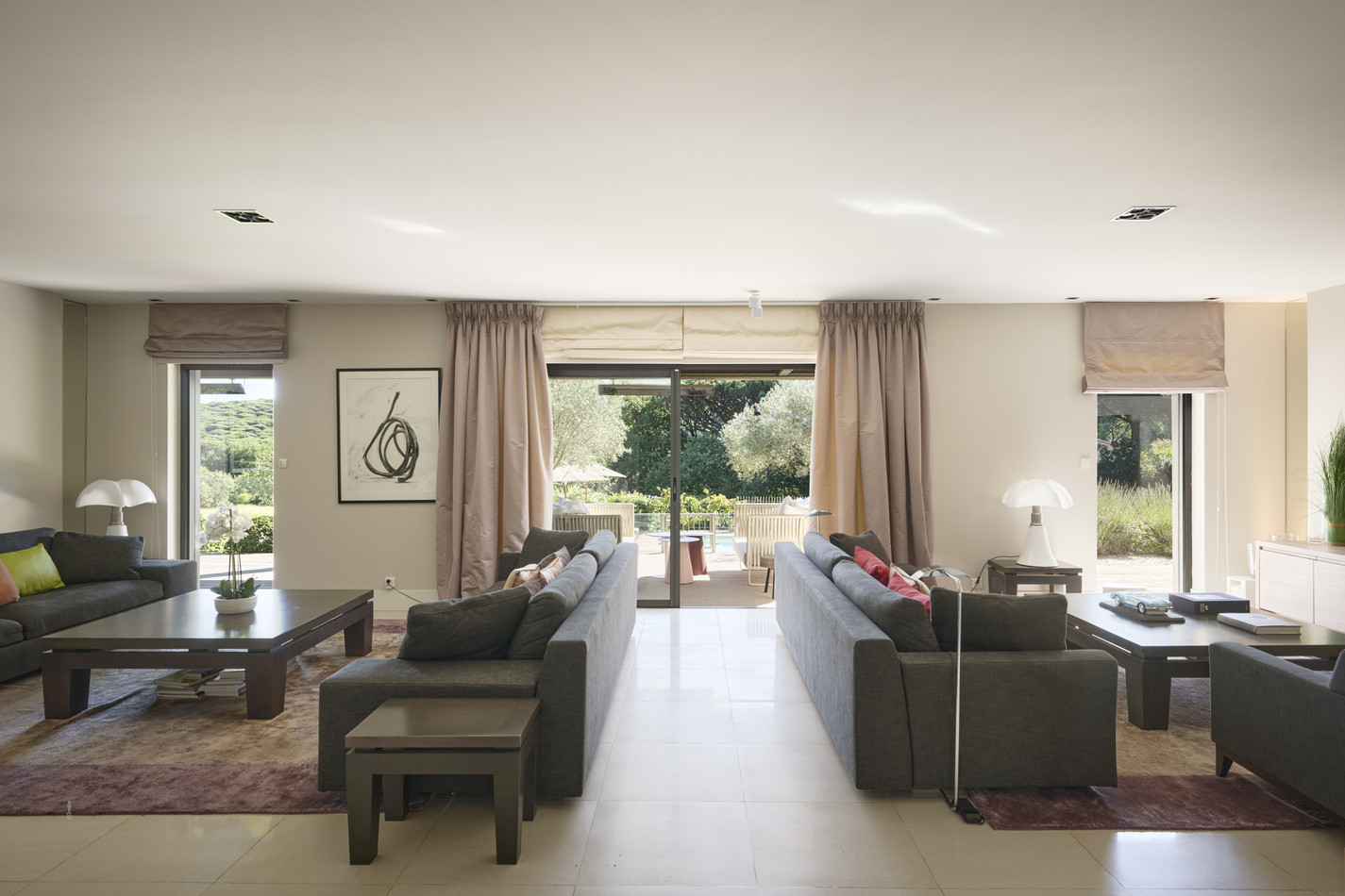 La maison s’organise autour d’un vaste séjour lumineux, largement ouvert sur l’extérieur grâce à de grandes baies vitrées donnant sur les terrasses et l’espace piscine.